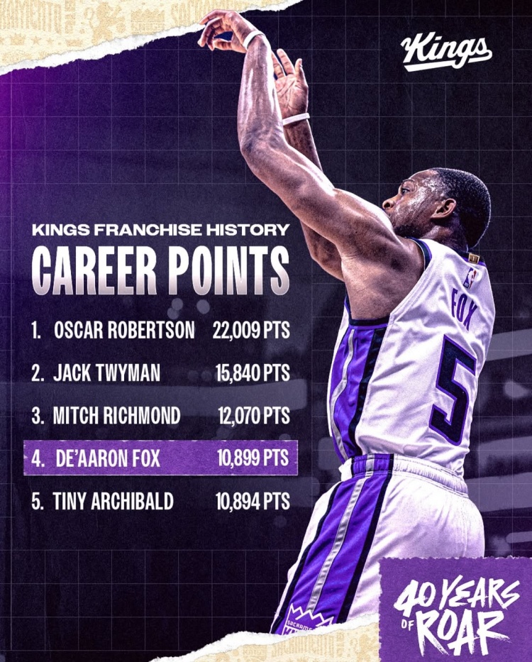 本場(chǎng)比賽過(guò)后,??怂股目偟梅謥?lái)到10899,國(guó)王隊(duì)史超越內(nèi)特-阿奇博爾德,上升至第四位。