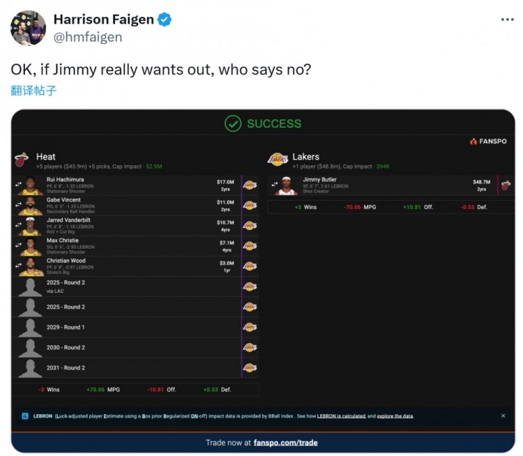 湖人隨隊記者Harrison Faigen曬出了自己的交易方案,湖人送出5名球員和5個選秀權(quán),具體如下: