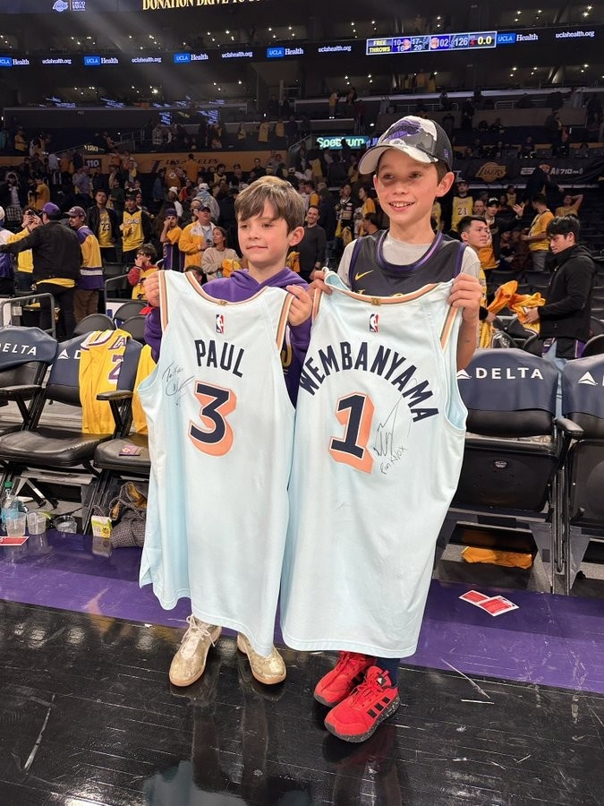 1月14日訊 NBA常規(guī)賽,馬刺126-102戰(zhàn)勝湖人。賽后,馬刺球員保羅和文班亞馬把自己的簽名球衣送給了雷迪克的兒子。