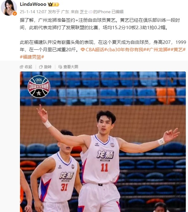 據(jù)了解,廣州龍獅準(zhǔn)備簽約+注冊自由球員黃藝。黃藝已經(jīng)在俱樂部訓(xùn)練一段時(shí)間,此前代表龍獅打了發(fā)展聯(lián)盟的比賽,場均15.2分10板2.3助1斷0.2帽。