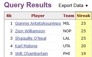 據(jù)統(tǒng)計(jì),字母哥已經(jīng)連續(xù)26場比賽砍下20+且投籃命中率50%+,他也超越錫安和奧尼爾(都為25場),獨(dú)居NBA歷史第一位!