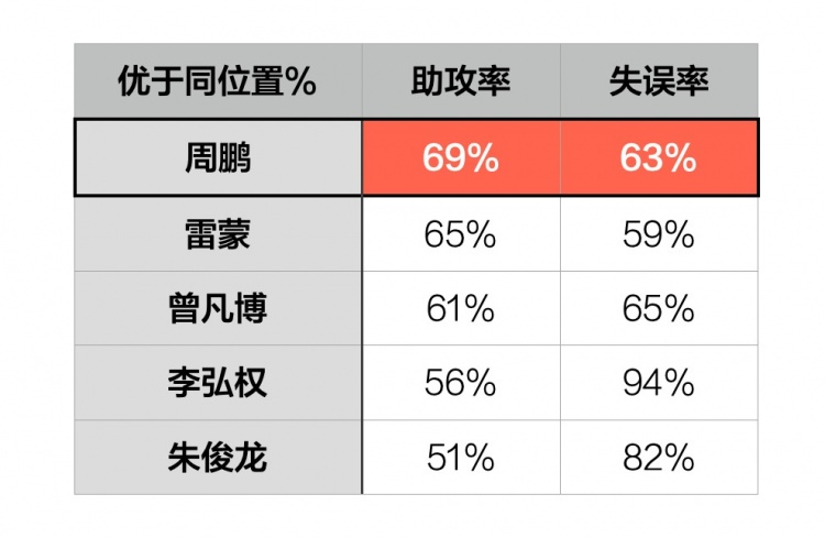 數(shù)據(jù)指標也能反應(yīng)周鵬作為策應(yīng)點撬動進攻效率,他的助攻率在本土鋒線球員里排第8,超過了69%的聯(lián)賽同位置球員。而達成這份助攻產(chǎn)量的同時,他的失誤率也優(yōu)于67%的聯(lián)賽同位置選手。
