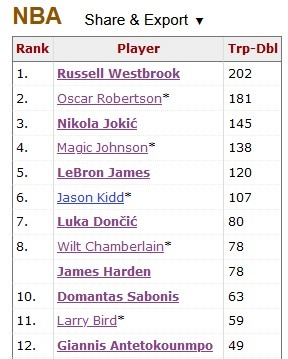 現(xiàn)役球員中,威少、約基奇、詹姆斯、東契奇、哈登、小薩博尼斯也都達(dá)成了這一成就。