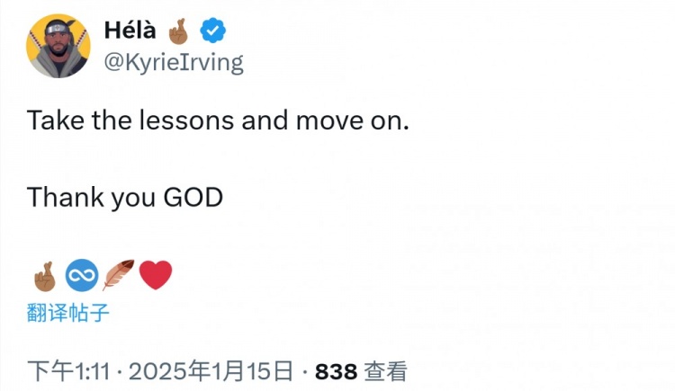 發(fā)布時間:2025年01月15日 14:09點(diǎn)擊:欄目:籃球新聞 1月15日訊 NBA常規(guī)賽,獨(dú)行俠99-118不敵掘金。賽后,歐文更新推特寫道:“吸取教訓(xùn),繼續(xù)前進(jìn)。感謝你,上帝?!?/p>此役,歐文迎來復(fù)出但表現(xiàn)不佳,打了30分鐘18投僅4中,三分3中0、罰球4中3拿到11分4籃板2助攻4搶斷1蓋帽,正負(fù)值-17。 除特別注明外,本站所有內(nèi)容均為九球直播整理排版,轉(zhuǎn)載請注明出處:不敵掘金!歐文賽后發(fā)推:吸取教訓(xùn)并繼續(xù)前進(jìn) 感謝上帝 本文標(biāo)簽: 籃球 nba 獨(dú)行俠 歐文