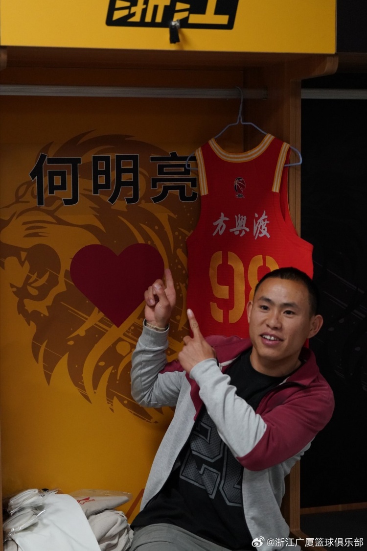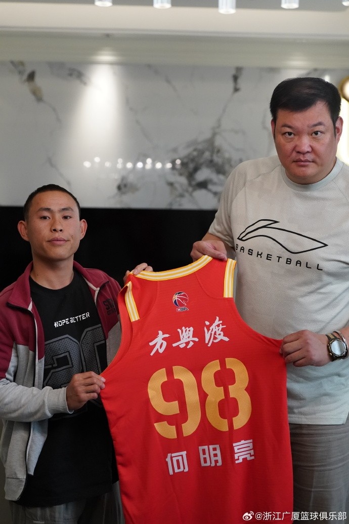 在去年12月2日和吉林隊(duì)的比賽當(dāng)天,浙江廣廈與何明亮簽訂了“CBA球員一日合同”,并贈(zèng)予他一件印有自己名字的98號(hào)專屬球衣?!?9和88是俱樂部兩個(gè)吉祥物的號(hào)碼,各取一個(gè)數(shù)字,代表了俱樂部對(duì)他的祝福?!闭憬瓘V廈籃球俱樂部總經(jīng)理繆壽守說。