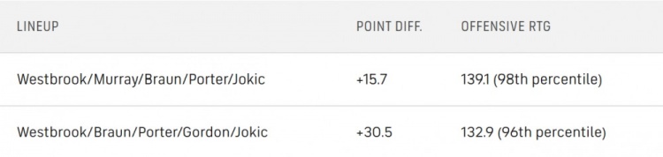 威少、布勞恩、波特、戈登、約基奇:凈勝分+30.5;進(jìn)攻效率132.9,超過聯(lián)盟96%的陣容組合)