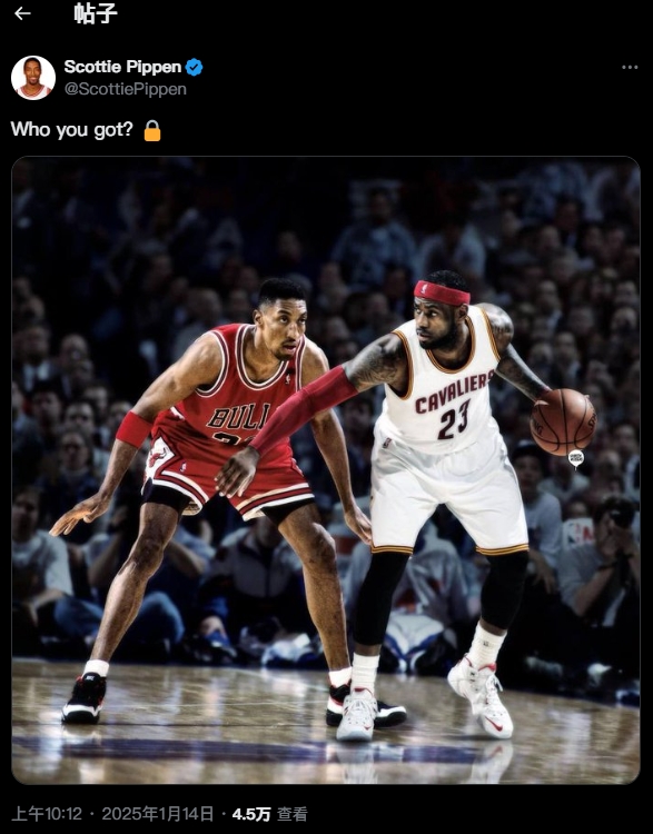 發(fā)布時(shí)間:2025年01月15日 20:54點(diǎn)擊:欄目:籃球新聞 01月15日訊 NBA名宿皮蓬更新個(gè)人推特,曬出了一張自己和詹姆斯的合成照片并發(fā)問(wèn):“誰(shuí)會(huì)贏?” 除特別注明外,本站所有內(nèi)容均為九球直播整理排版,轉(zhuǎn)載請(qǐng)注明出處:1v1還是5v5?皮蓬曬自己和詹姆斯合成照:你覺(jué)得誰(shuí)會(huì)贏? 本文標(biāo)簽: 籃球 nba 湖人 騎士 詹姆斯