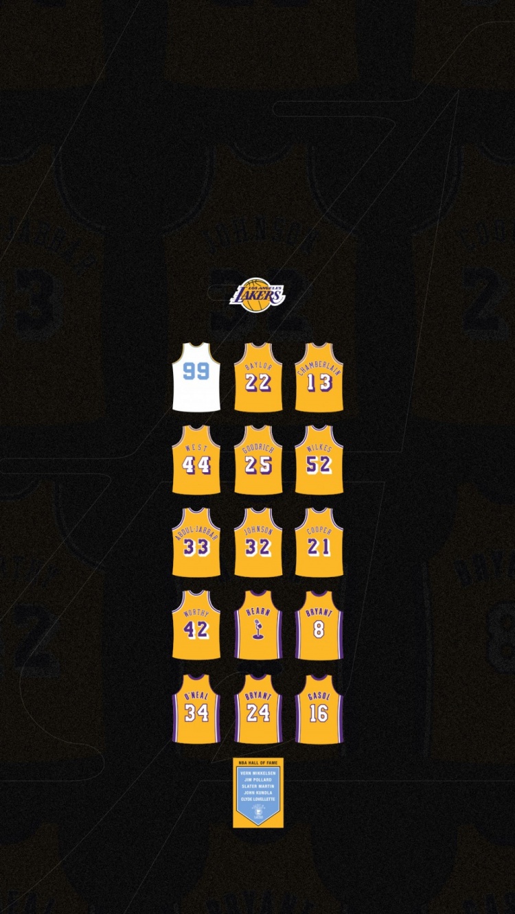 注:兩面沒有號(hào)碼的退役球衣分別是湖人傳奇播音員赫恩專屬退役球衣;另一件退役球衣上書寫了湖人在明尼阿波利斯時(shí)代、所有入選過名人堂球員們的名字!