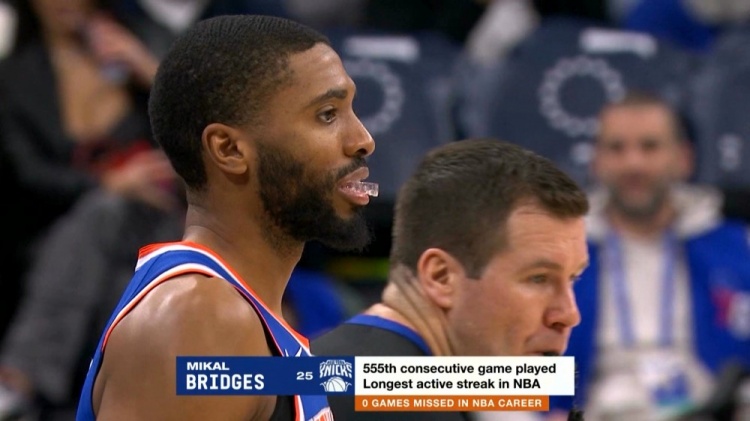 比賽中轉(zhuǎn)播方把鏡頭給到尼克斯球員米卡爾-布里奇斯,并曬出數(shù)據(jù):算上今天大橋已連續(xù)出戰(zhàn)555場(chǎng),這是現(xiàn)役球員的最長(zhǎng)紀(jì)錄。