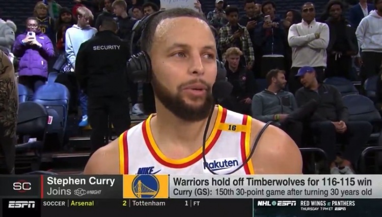 本場比賽,庫里出戰(zhàn)37分鐘,21投10中,三分12中7,罰球4中4,砍31分1板8助1斷。