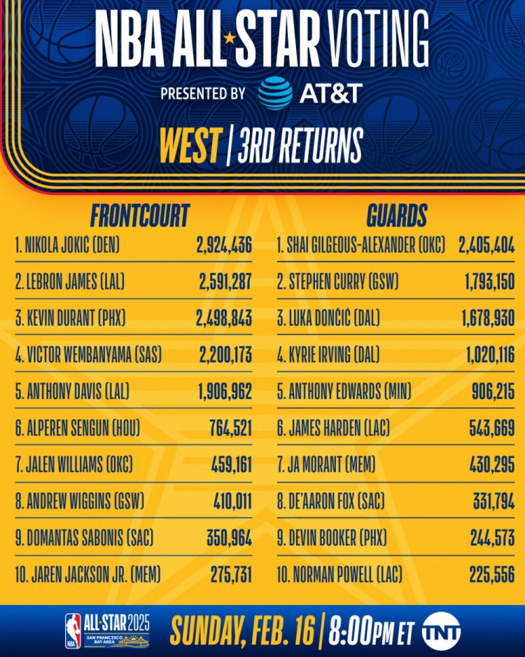 1月17日訊 NBA官方公布了2025年舊金山全明星周末第三階段球迷投票結(jié)果。
