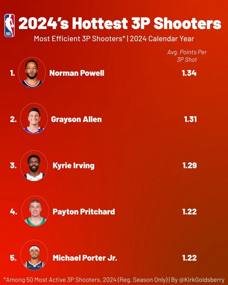 發(fā)布時(shí)間:2025年01月03日 13:52點(diǎn)擊:欄目:籃球新聞 1月3日訊 今日數(shù)據(jù)專家Kirk Goldsberry曬出了2024年全聯(lián)盟最高效三分投手榜單。具體如下:1、鮑威爾 平均每次三分出手得1.34分2、格雷森-阿倫 1.31分3、歐文 1.29分4、普理查德 1.22分小邁克爾-波特 1.22分注:統(tǒng)計(jì)范圍是全年常規(guī)賽三分出手前50的球員 除特別注明外,本站所有內(nèi)容均為九球直播整理排版,轉(zhuǎn)載請注明出處:2024年最高效三分投手TOP5:鮑威爾/阿倫/歐文/普理查德/小波特 本文標(biāo)簽: 籃球 nba 快船 獨(dú)行俠 歐文 太陽 掘金 凱爾特人