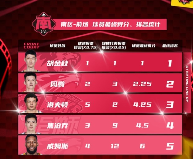發(fā)布時間:2025年01月17日 13:03點擊:欄目:籃球新聞 1月17日訊 CBA官方今日公布了本賽季全明星首發(fā)陣容。其中,上海外援洛夫頓入選了CBA南區(qū)全明星首發(fā),他在球迷投票中排在南區(qū)前場第五,但媒體投票排第二,綜合排在第三,直接進入首發(fā)。賽季至今,洛夫頓場均能得到24.4分13.1籃板6.7助攻1.7搶斷0.9蓋帽。 除特別注明外,本站所有內容均為九球直播整理排版,轉載請注明出處:洛夫頓球迷投票排第五&但媒體投票排第二 直接沖進首發(fā) 本文標簽: CBA 中國籃球 籃球 上海