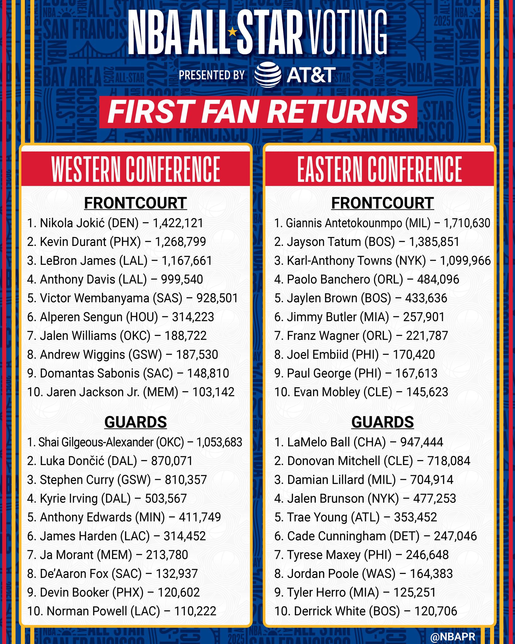 01月03日訊 NBA官方公布了2025年舊金山全明星周末第一階段球迷投票結(jié)果,其中拉梅洛-鮑爾高居?xùn)|部后場第一,后衛(wèi)總票數(shù)僅次亞歷山大。