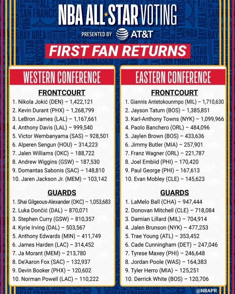 1月3日訊 今日,NBA2025年全明星首階段投票結(jié)果出爐。