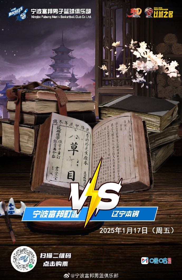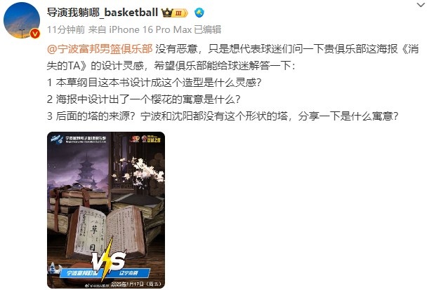 賽前寧波男籃官博曬出預熱海報,在打開的《本草綱目》書籍中,缺少了“本綱”二字,與遼寧本鋼諧音。