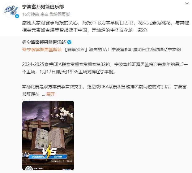 寧波男籃官博隨后也發(fā)文寫道:“感謝大家對賽事海報的關心,海報中書為本草綱目古書,花朵元素為桃花,與其他相關元素如古塔等皆起源于中國,是燦爛的中華文化的一部分?!?/p>