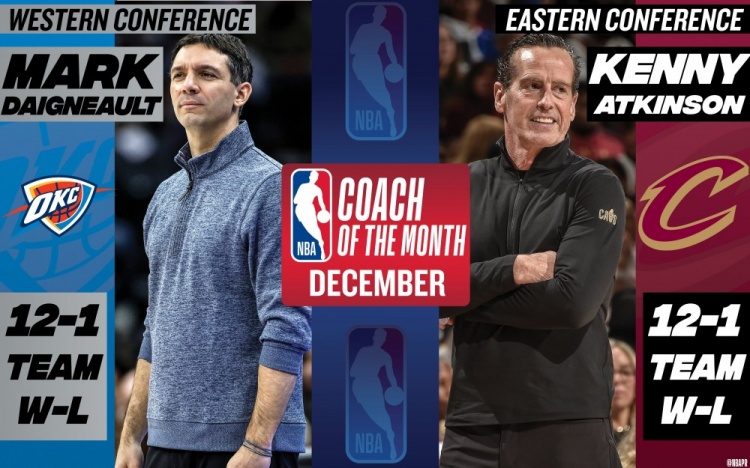 1月3日訊 今日NBA官方宣布,雷霆主帥戴格諾特與騎士主帥阿特金森在12月中被評(píng)為西部和東部聯(lián)盟月度最佳教練。
