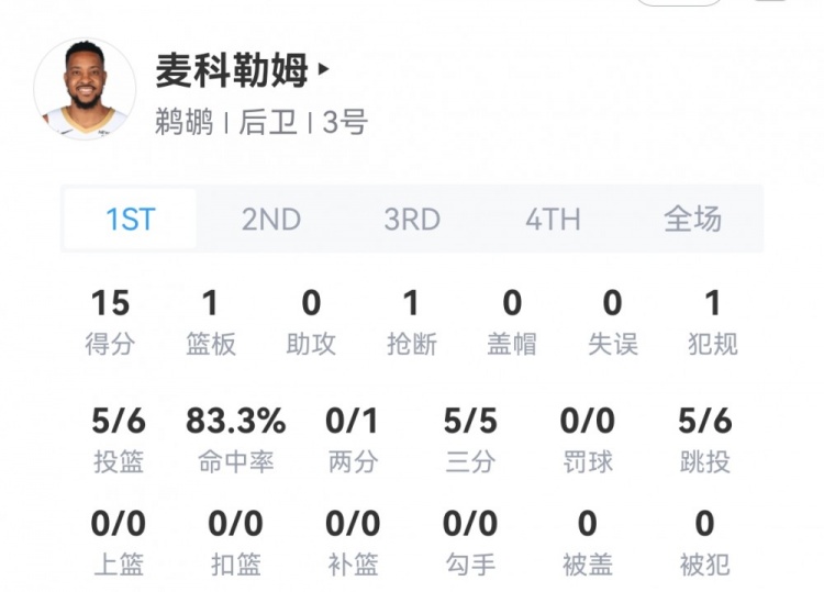 前半節(jié),鵜鶘后衛(wèi)麥科勒姆手感滾燙,打了6分鐘6投5中,三分5中5獨(dú)得15分,幫助球隊取得15分以上優(yōu)勢。