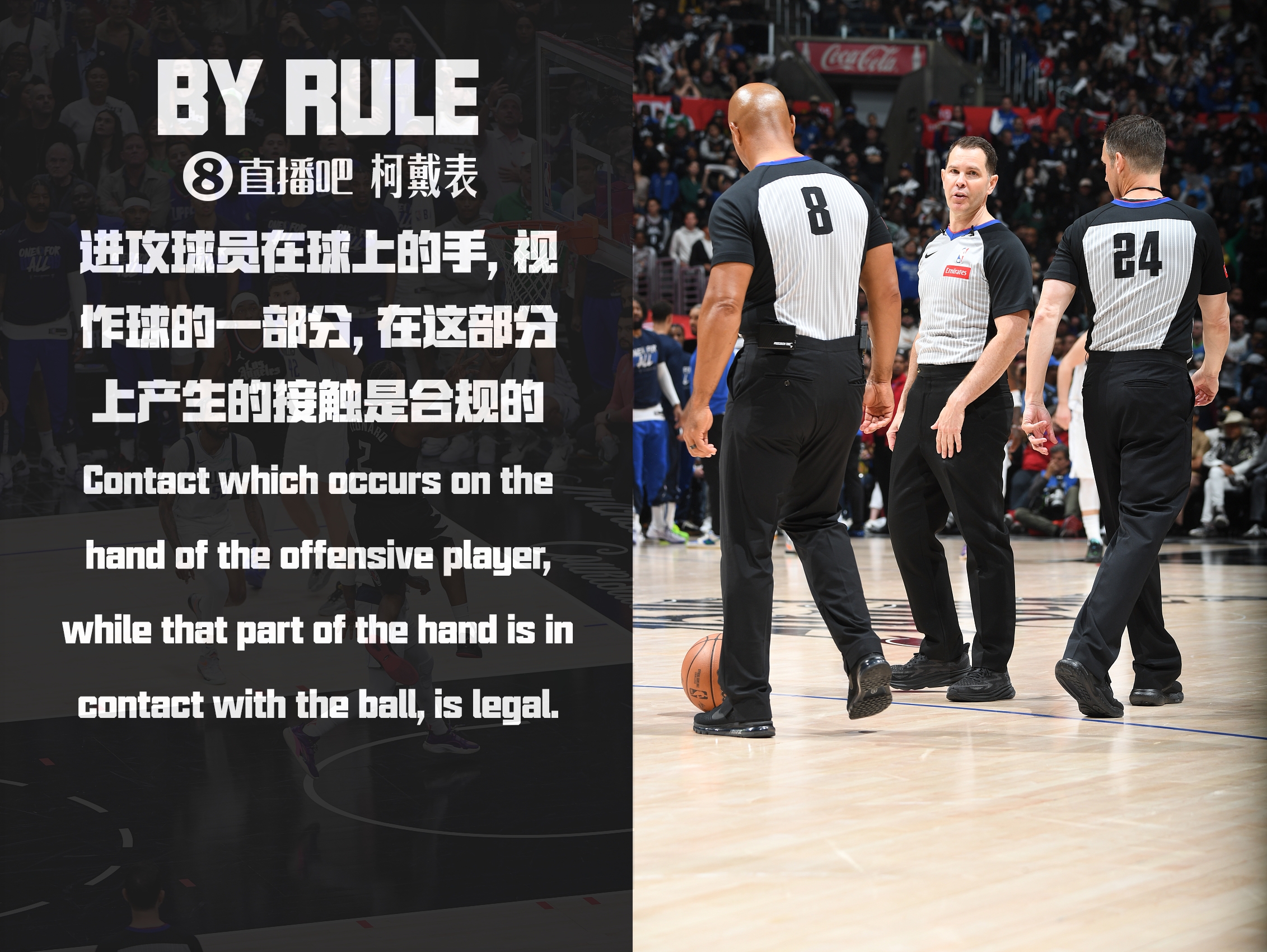 NBA規(guī)則有言:“進(jìn)攻球員與球接觸的手,被視作球的一部分,在這部分上產(chǎn)生的接觸是合規(guī)的(Contact which occurs on the hand of the offensive player, while that part of the hand is in contact with the ball, is legal.)?!薄?strong>這便是NBA的球手一體規(guī)則。