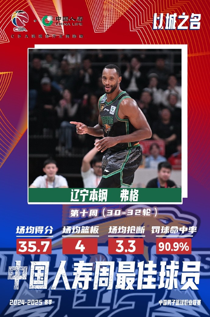 1月19日訊 今日,CBA官方宣布,弗格當(dāng)選常規(guī)賽第十周中國人壽周最佳外援。原文如下: