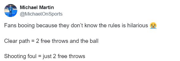 原來(lái),雷霆球迷覺(jué)得這是個(gè)投籃犯規(guī),應(yīng)該獲得兩罰,卻不知道“越位犯規(guī)”可以獲得兩罰一擲,這顯然是最好的結(jié)果。