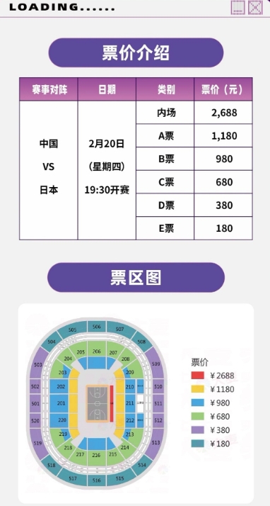 今日,本場比賽的票價公布,一共分為6檔,分別是:E票180元、D票380元、C票680元、B票980元、A票1180票、內(nèi)場2688元。