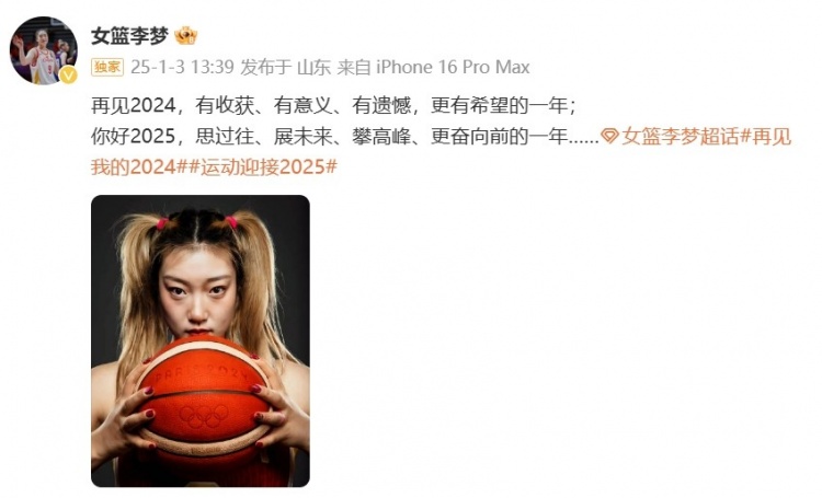 發(fā)布時(shí)間:2025年01月03日 19:50點(diǎn)擊:欄目:籃球新聞 1月3日訊 中國(guó)女籃球員李夢(mèng)更新社媒,展望2025年。李夢(mèng)寫道:“再見(jiàn)2024,有收獲、有意義、有遺憾,更有希望的一年;“你好2025,思過(guò)往、展未來(lái)、攀高峰、更奮向前的一年……” 除特別注明外,本站所有內(nèi)容均為九球直播整理排版,轉(zhuǎn)載請(qǐng)注明出處:李夢(mèng):2024有收獲有遺憾更有希望 2025思過(guò)往展未來(lái)攀高峰 本文標(biāo)簽: 籃球 CBA 中國(guó)籃球 WCBA
