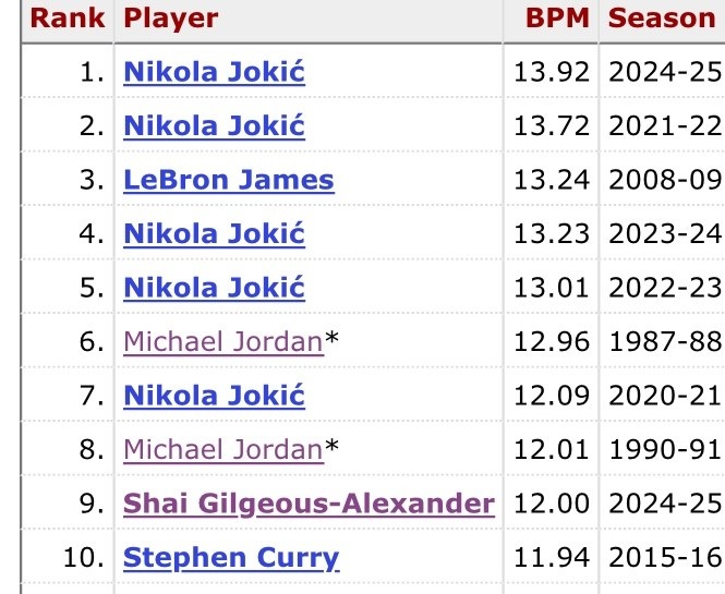 據(jù)統(tǒng)計(jì),亞歷山大本賽季的BPM高達(dá)12.00,可以排在歷史第九。其中3名球員霸占前八,他們分別是約基奇(獨(dú)占5席)、喬丹(2次)和詹姆斯。