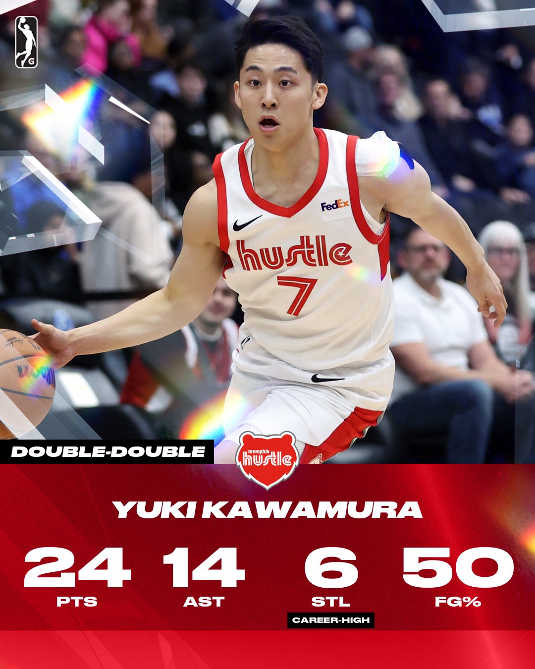本場(chǎng)比賽,灰熊雙向合同后衛(wèi)河村勇輝繼續(xù)在G聯(lián)賽發(fā)光發(fā)熱,他獲得全隊(duì)最多的40分35秒出場(chǎng)時(shí)間,也不負(fù)眾望拿到全隊(duì)最高的得分、助攻以及搶斷,14投7中,其中三分10中4,另外罰球4中3,砍下24分3籃板14助攻6搶斷(生涯新高)1蓋帽,出現(xiàn)3次失誤,正負(fù)值-1。