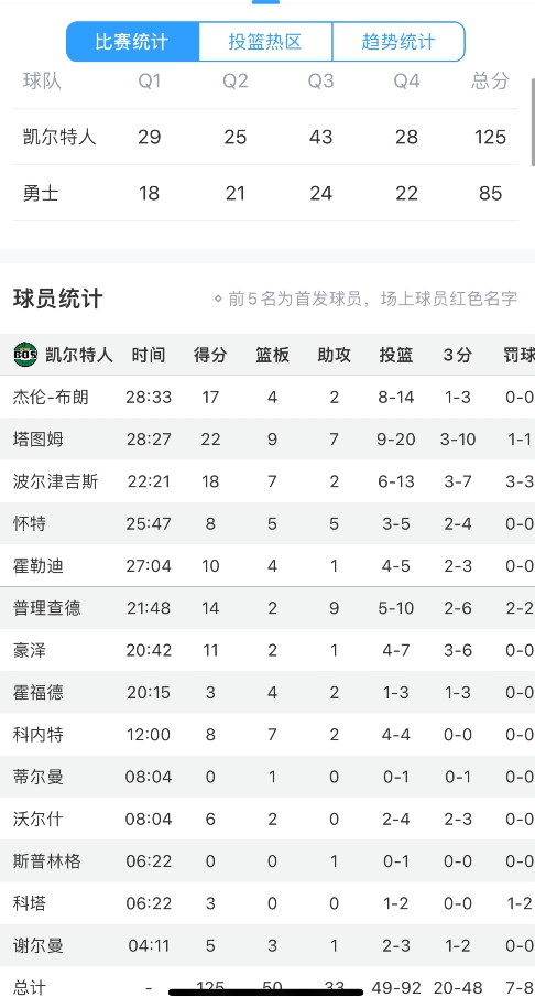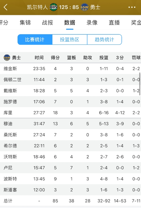 本場(chǎng)凱爾特人杰倫-布朗缺陣,但依然是實(shí)力雄厚,但勇士確實(shí)打得相當(dāng)有章法,賽季前幾場(chǎng)比賽劃水的庫里本場(chǎng)比賽出場(chǎng)時(shí)間首次超過30分鐘,砍下27分7板9助4斷1帽,下半場(chǎng)0失誤砍21分,最后時(shí)刻得分+助攻殺死比賽,最終帶隊(duì)贏下比賽。