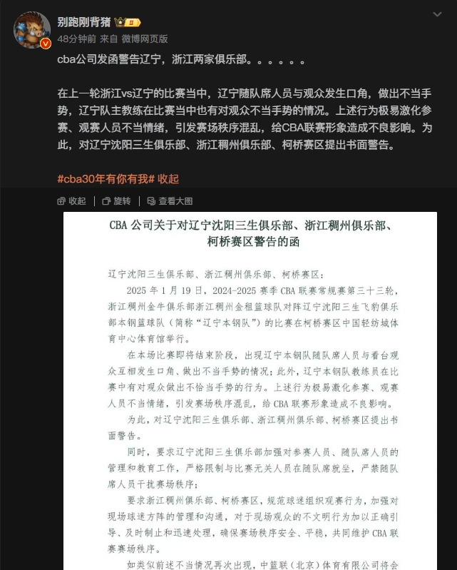 今日,微博媒體人“別跑剛背豬”曬出相關(guān)文件,文件內(nèi)容為CBA公司針對(duì)上述事件對(duì)遼寧&浙江以及相關(guān)賽區(qū)提出書面警告。