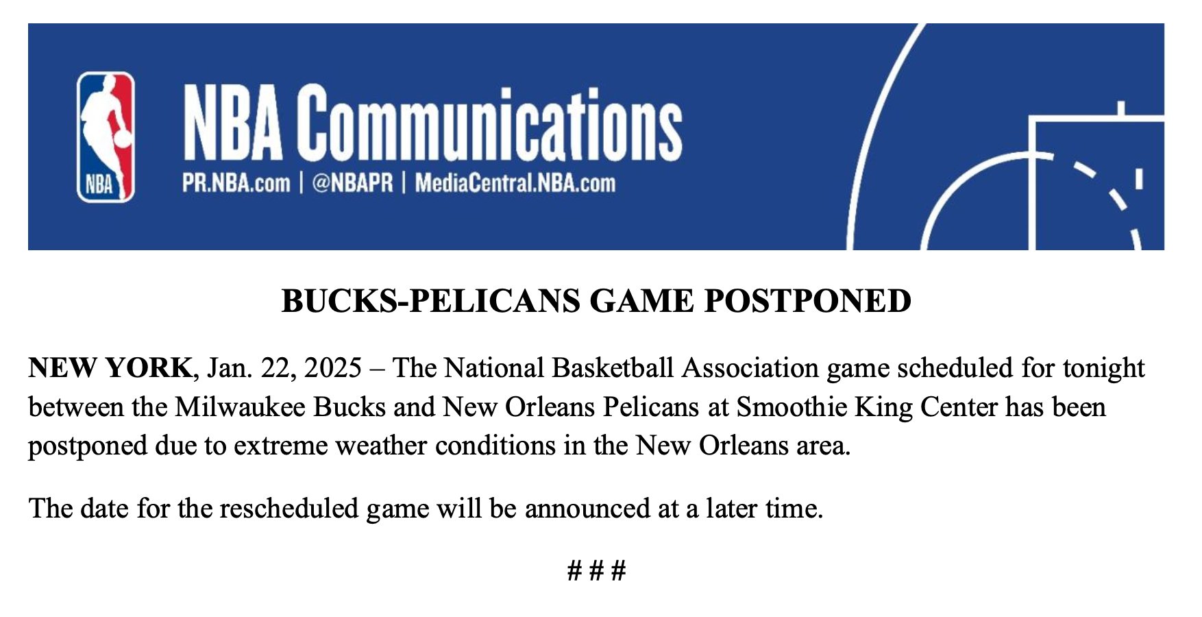 01月23日訊 NBA官方宣布,雄鹿與鵜鶘23日9點(diǎn)的比賽因極端天氣影響將延期。