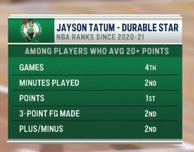 在場均20+的球員中,塔圖姆的出戰(zhàn)場次第四,出場時(shí)間第二,總得分第一,三分命中數(shù)第二,總正負(fù)值第二。