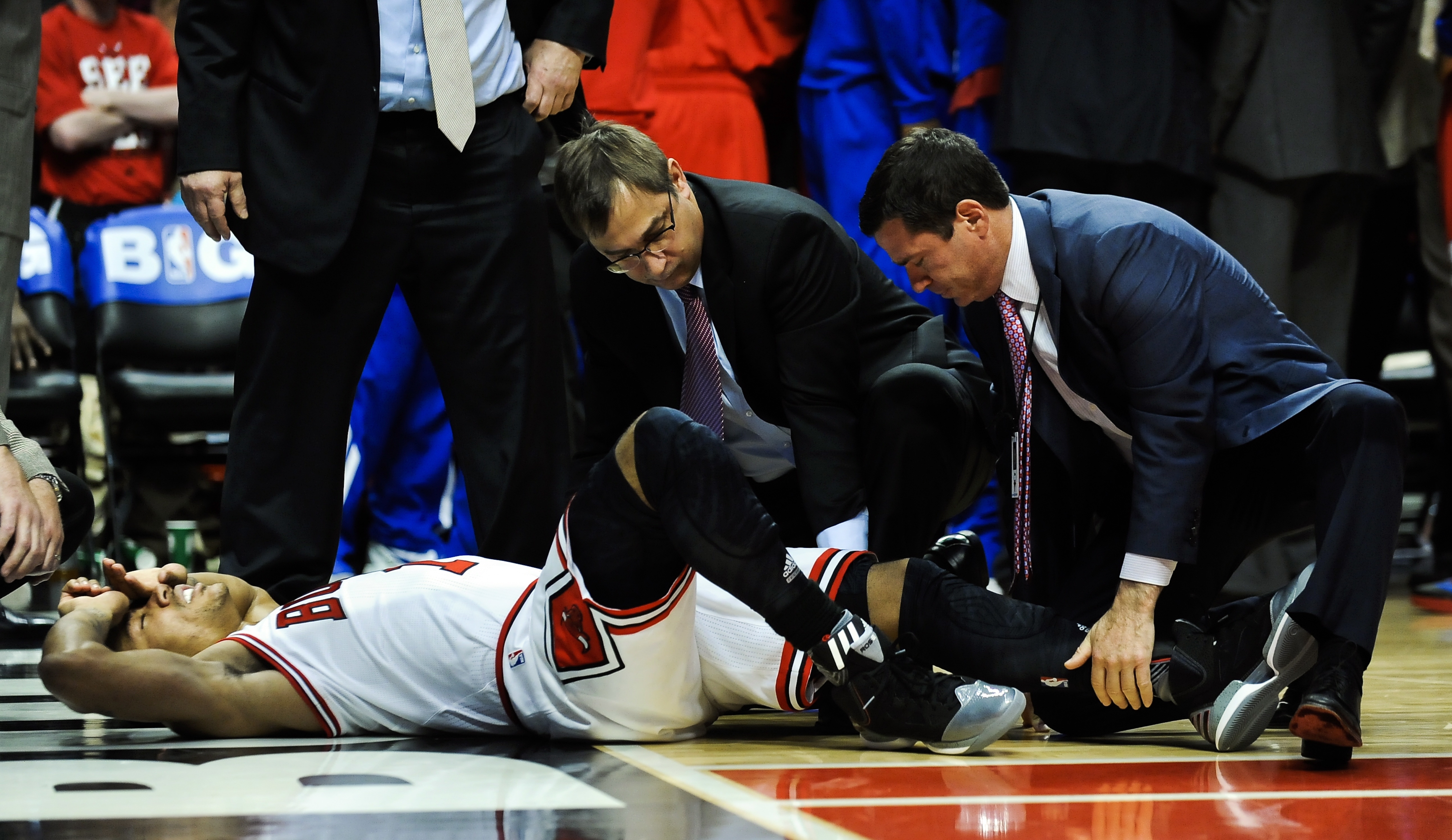 2012年4月28日,在公牛與76人的季后賽首輪第一場(chǎng)比賽中,羅斯在一次突破變向時(shí),右膝突然扭曲,隨后痛苦倒地。經(jīng)診斷,羅斯遭遇了右膝前交叉韌帶撕裂。