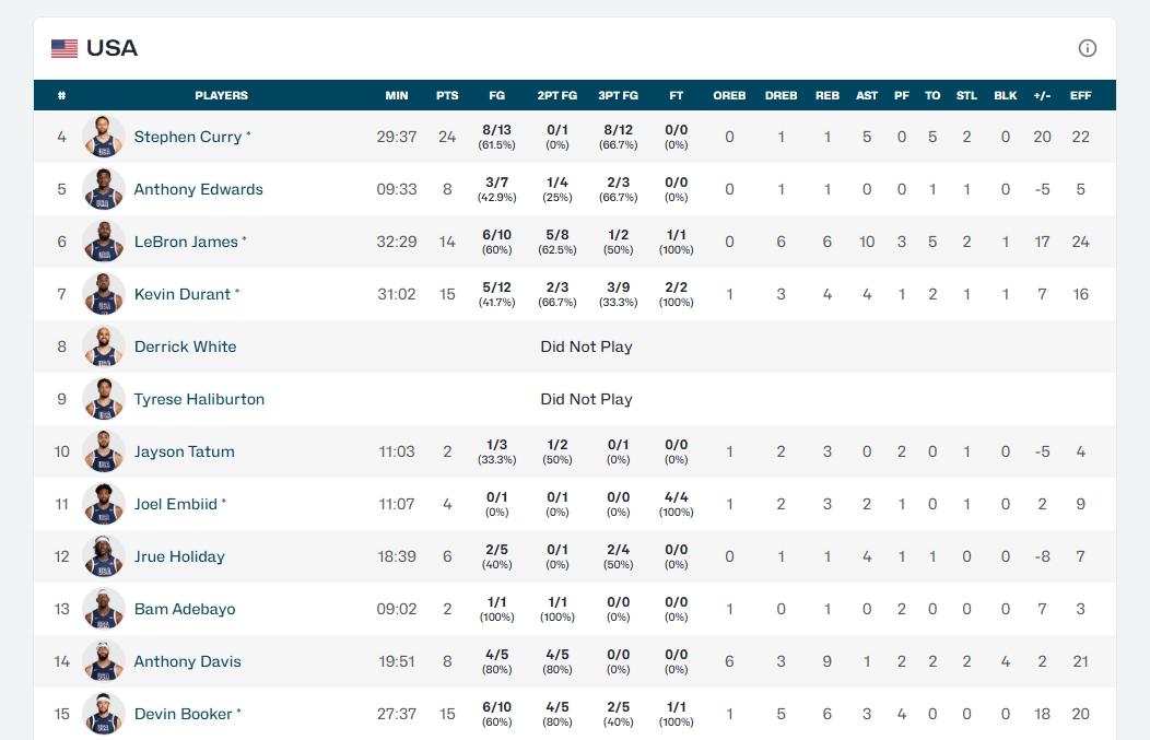 奧運(yùn)會(huì)決賽數(shù)據(jù):詹庫(kù)杜首發(fā)!