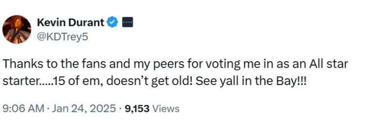 杜蘭特更推道:“感謝球迷和同行們給我投票,讓我成為全明星先發(fā)。第15次了,還沒變老。灣區(qū)見!”