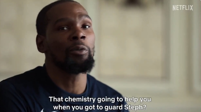 鏡頭一轉(zhuǎn),給到杜蘭特,他說:“OK,行吧,那你們的化學(xué)反應(yīng)在防守庫里的時候起到幫助作用了嗎?”