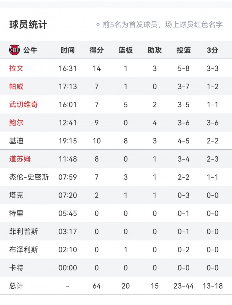 上半場,公牛外線神準,全隊三分18投13中,命中率高達72.2%,其中拉文三分3投3中。