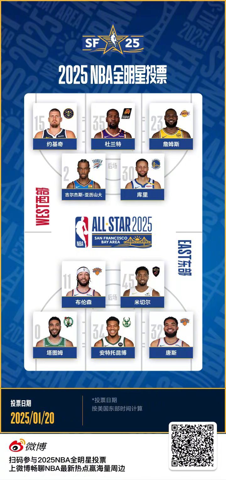 01月24日訊 NBA官方公布了2025年全明星首發(fā)陣容: