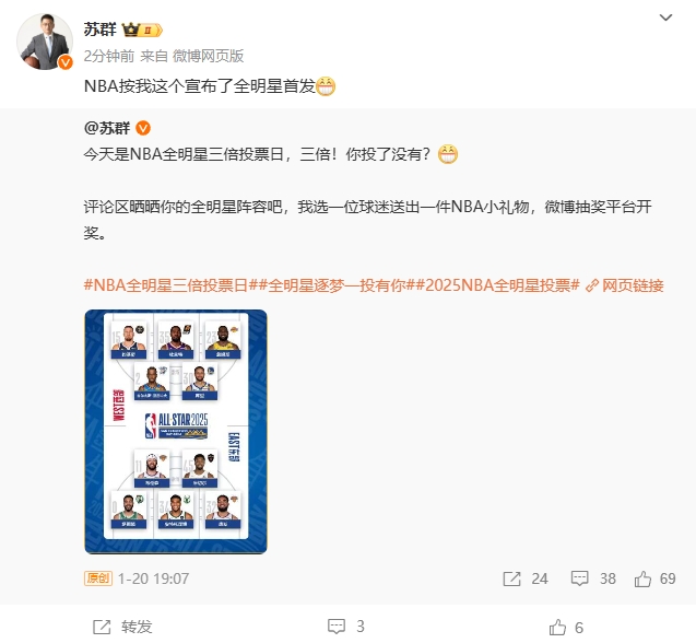 籃球評(píng)論員蘇群更新微博動(dòng)態(tài)寫道:“NBA按我這個(gè)宣布了全明星首發(fā)?!?/span>