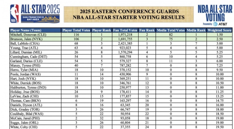 - 球迷票僅次三球!米切爾霸占東部后場第一 球員票和媒體票均第一