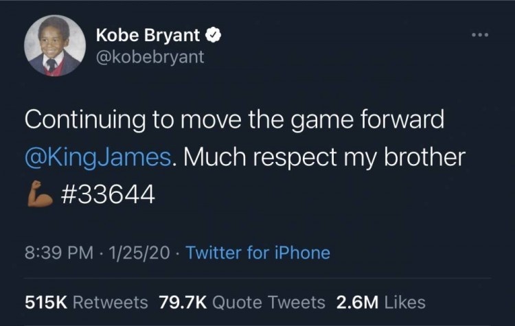 賽后,科比也發(fā)文恭喜了詹姆斯: