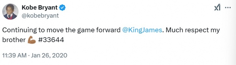 - 五年前的今天:科比人生最后一條推特 恭喜詹姆斯總得分超越自己