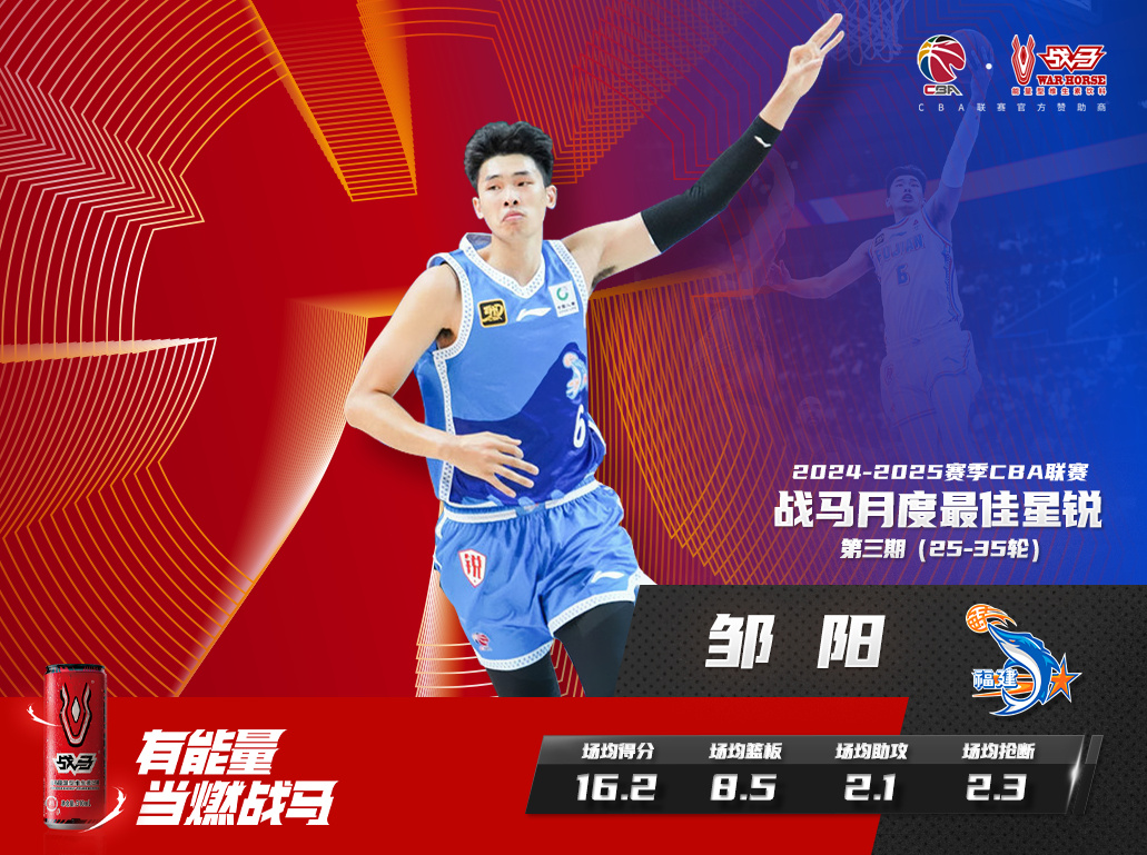 01月27日訊 CBA官方宣布,福建鄒陽(yáng)獲得獲得2024-2025賽季CBA聯(lián)賽第3期月度最佳星銳球員!