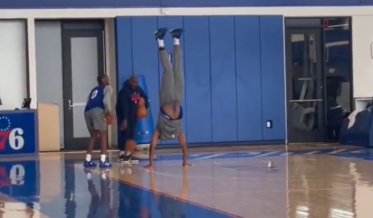 - 最新訓(xùn)練法?76人隊(duì)內(nèi)訓(xùn)練馬克西苦練投籃 恩比德在旁邊倒立