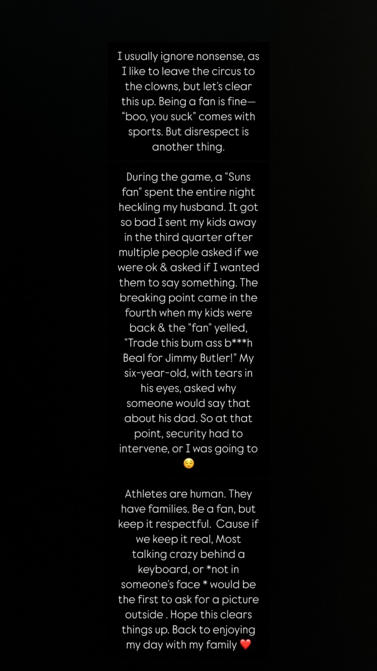 在比賽期間,一位“太陽隊球迷”整晚都在辱罵我的丈夫,情況變得如此糟糕,以至于我在第三節(jié)把孩子送走了,因為有多人問我們是否還好,并問我是否希望他們說些什么。第四節(jié)的爆發(fā)點是當我的孩子回來時,那個球迷喊道:“把這個廢物比爾換成吉米-巴特勒!”