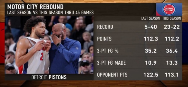 本賽季至今,活塞取得23勝22負,暫列東部第六;而上賽季同期他們僅5勝40負。