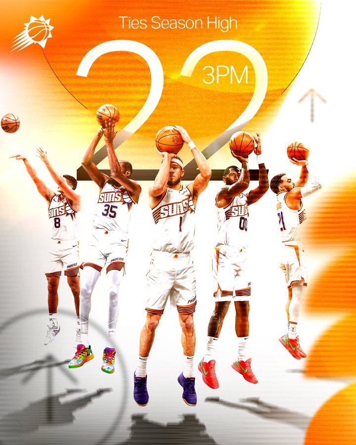 本場比賽,太陽全隊(duì)三分球47投22中,這也追平了球隊(duì)本賽季的單場三分命中數(shù)紀(jì)錄。