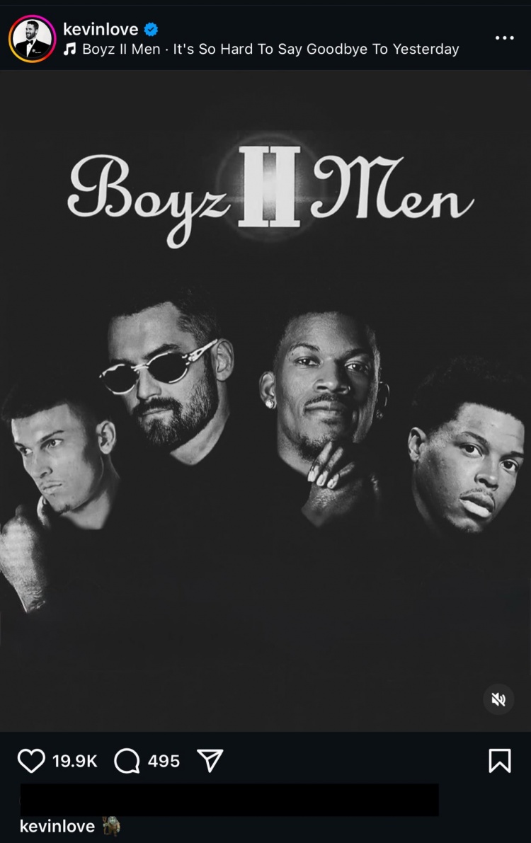 熱火老將樂福更新IG曬出一張自己、巴特勒、希羅和洛瑞4人模仿著名的R&B演唱組合Boyz II Men的P圖,并曬出該組合單曲《It's So Hard To Say Goodbye To Yesterday(和昨天難說再見)》。